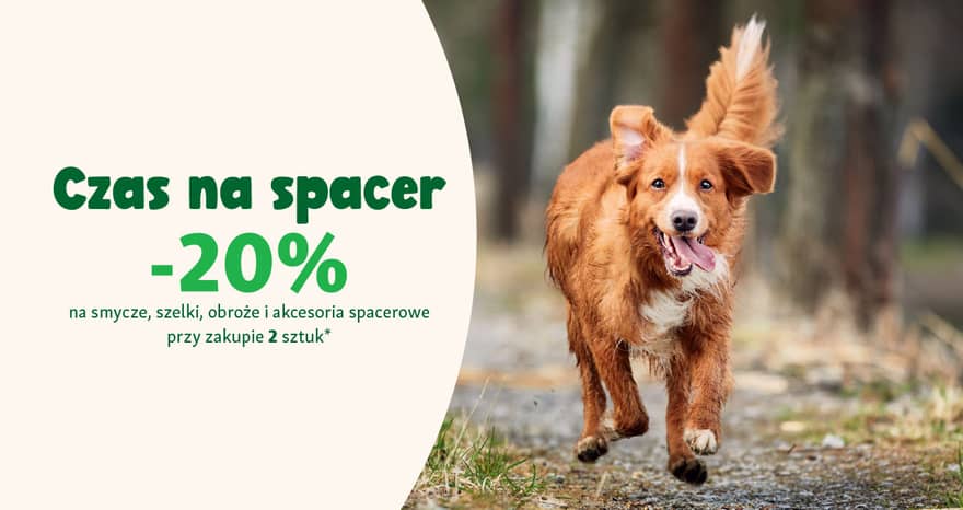 *Promocja obowiązuje w dniach 16.04–6.05.2026 lub do wyczerpania zapasów promocyjnych. Oferta dotyczy produktów z kategorii: smycze, szelki, obroże, akcesoria spacerowe i woreczki na odchody, z wyłączeniem produktów oznaczonych jako „Nasza niska cena” oraz smyczy automatycznych. Oferta obowiązuje w sklepach stacjonarnych. Dostępność produktów w zależności od lokalizacji może się różnić.